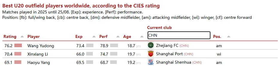 虎扑09月04日讯 近日,知名足球数据网站CIES(足球天文台)发布全球U20球员前200强榜单。巴萨年轻巨星亚马尔排名第一,中国球员王钰栋、李新翔、杨皓宇在列。