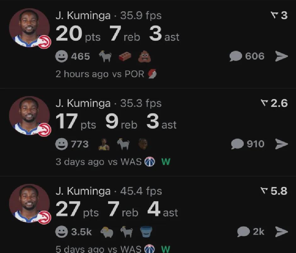 迄今为止库明加为老鹰出战三场比赛首发1次全部取胜,分别贡献27分7板4助2断、17分9板3助1断1帽,和20分7板3助2断,三战投篮合计31中21,命中率高达约68%,其中三分球合计9中5,命中率达到约56%。
